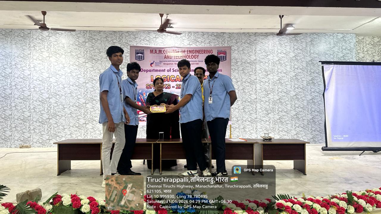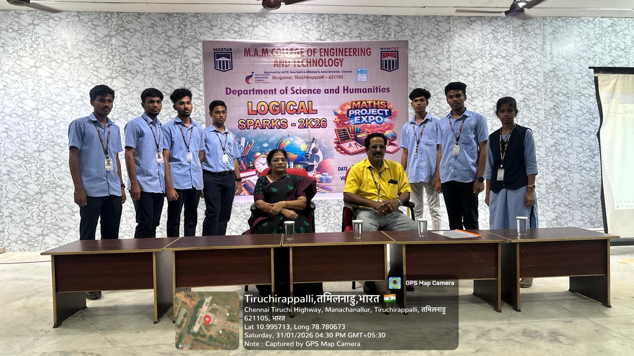 The Department of Science & Humanities, M.A.M. College of Engineering and Technology, successfully conducted the “Logical Sparks – 2K26” Maths Project Expo on 31st January 2026 at Newton Hall. Our first-year students showcased creative and innovative maths projects, highlighting their logical thinking and problem-solving skills. Kudos to all participants and faculty mentors for making the event a great success!