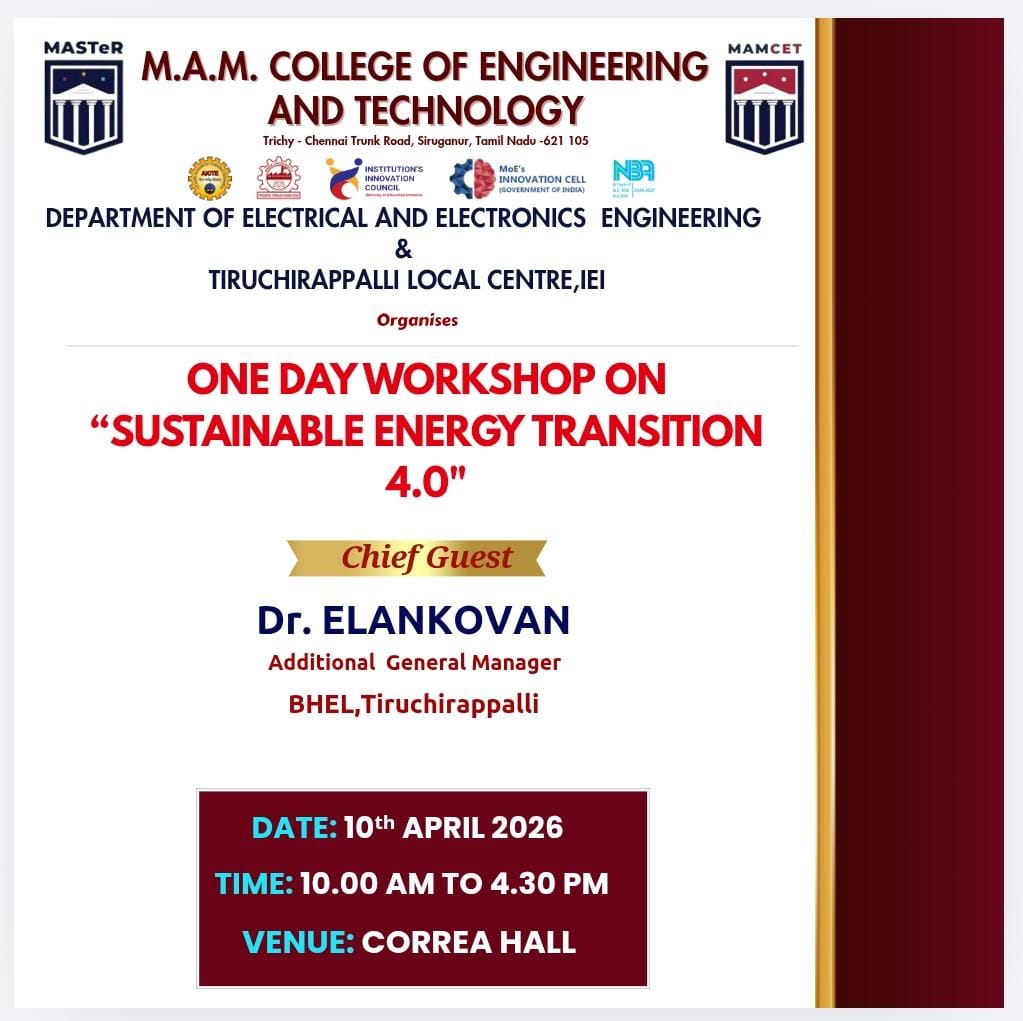 Sustainable Energy Transition 4.0 📅Date : 10.04.2026🌐Venue : Correa Hall👨🏫Resource Person: Dr. ElankovanAdditional General ManagerBHEL, Tiruchirappalli