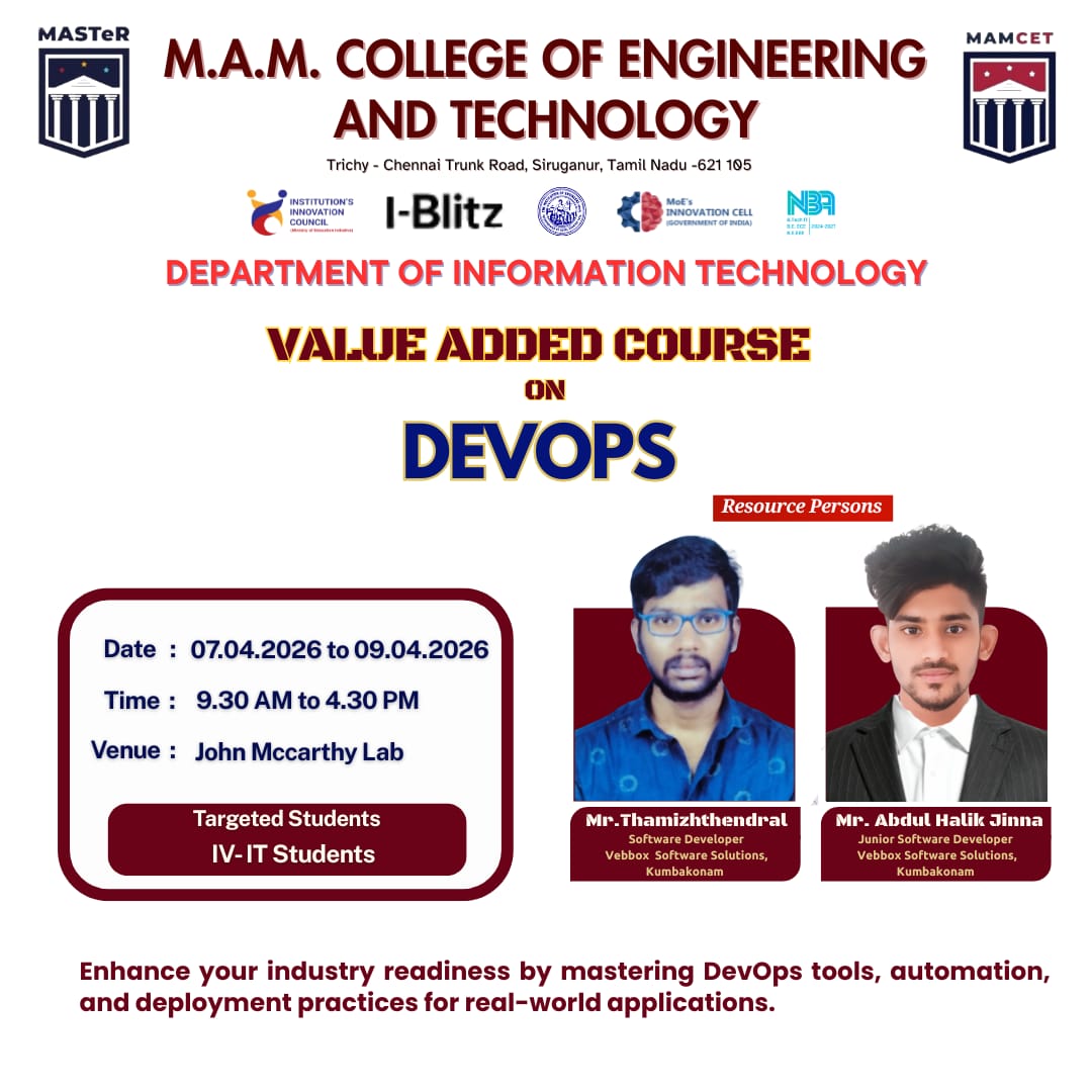 Value Added Course on DevOps 📅Date : 07.04.2026 to 09.04.2026🌐Venue : John McCarthy Lab👨🏫Resource Person:Mr. Thamizhzthendral,Software Developer,Vebbox Software Solutions, Kumbakonam.Mr. Abdul Halik Jinna,Junior Software Developer,Vebbox Software Solutions, Kumbakonam
